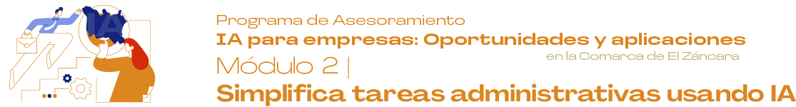 Inicio 5 Programa de Asesoramiento 4 5 Módulo 2: Simplifica tareas administrativas usando IA Volver atrás Módulo 2 Recursos del Módulo Contenido teórico Acceder Podcast Acceder Ejercicio práctico Acceder Lecturas complementarias PCómo Aplicar la IA en tus Tareas Administrativas P8 Procesos que se Pueden Automatizar con IA PImpulsa tu departamento de administración con IA: aumenta eficiencia y reduce costos PLa IA y el futuro del trabajo: tendencias y estadísticas Vídeos complementarios PCómo usar ChatGPT para redactar: Correos y solicitudes - Curso de ChatGPT P¿Qué es la inteligencia artificial? PConvierte Excel en una Herramienta de IA con ChatGPT